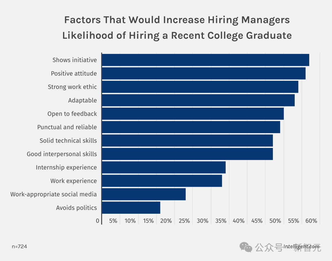 当被问及哪些要素会让他们更倾向于招聘时,57% 和 56% 的公司示意展现主动性和积极魄力是进攻要素,53% 以为得当才略至关进攻。