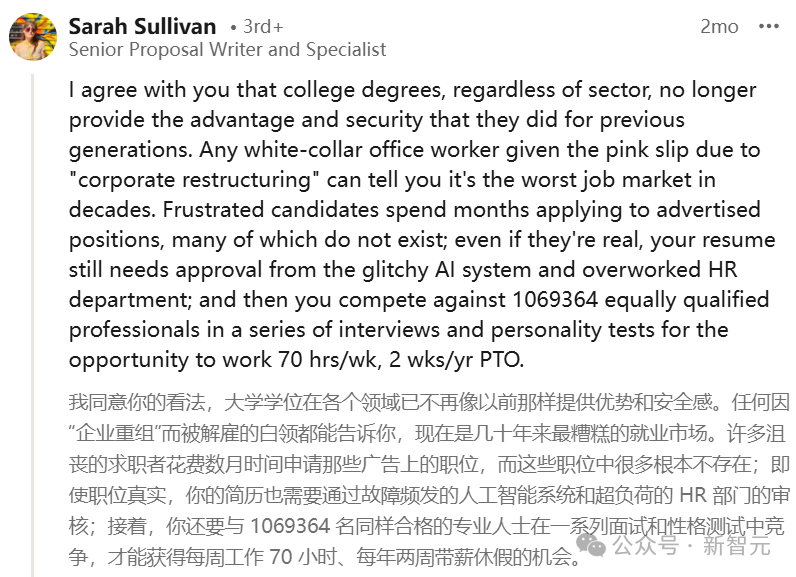 在教诲的帖子下,不少东谈主示意赞同:「如今好意思国的工作阛阓,不错说是处于几十年来最厄运的时期。」